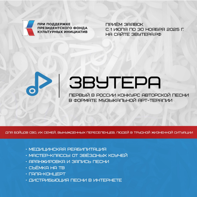 1 июля 2025 года стартует уникальный конкурс для авторов и исполнителей песен «Звутера» – участниками конкурса могут стать участники СВО, члены их семей, вынужденные переселенцы, а также граждане, которые попали в трудную жизненную ситуацию. Финалисты смогут записать свои песни на профессиональной студии, сняться на ТВ, выступить на большом гала-концерте. Лучшие работы будут выложены на все известные музыкальные сервисы. Также участникам будет оказана профессиональная медицинская помощь в реабилитации посттравматического синдрома. Проект реализуется при поддержке Президентского фонда культурных инициатив и не имеет аналогов в стране.